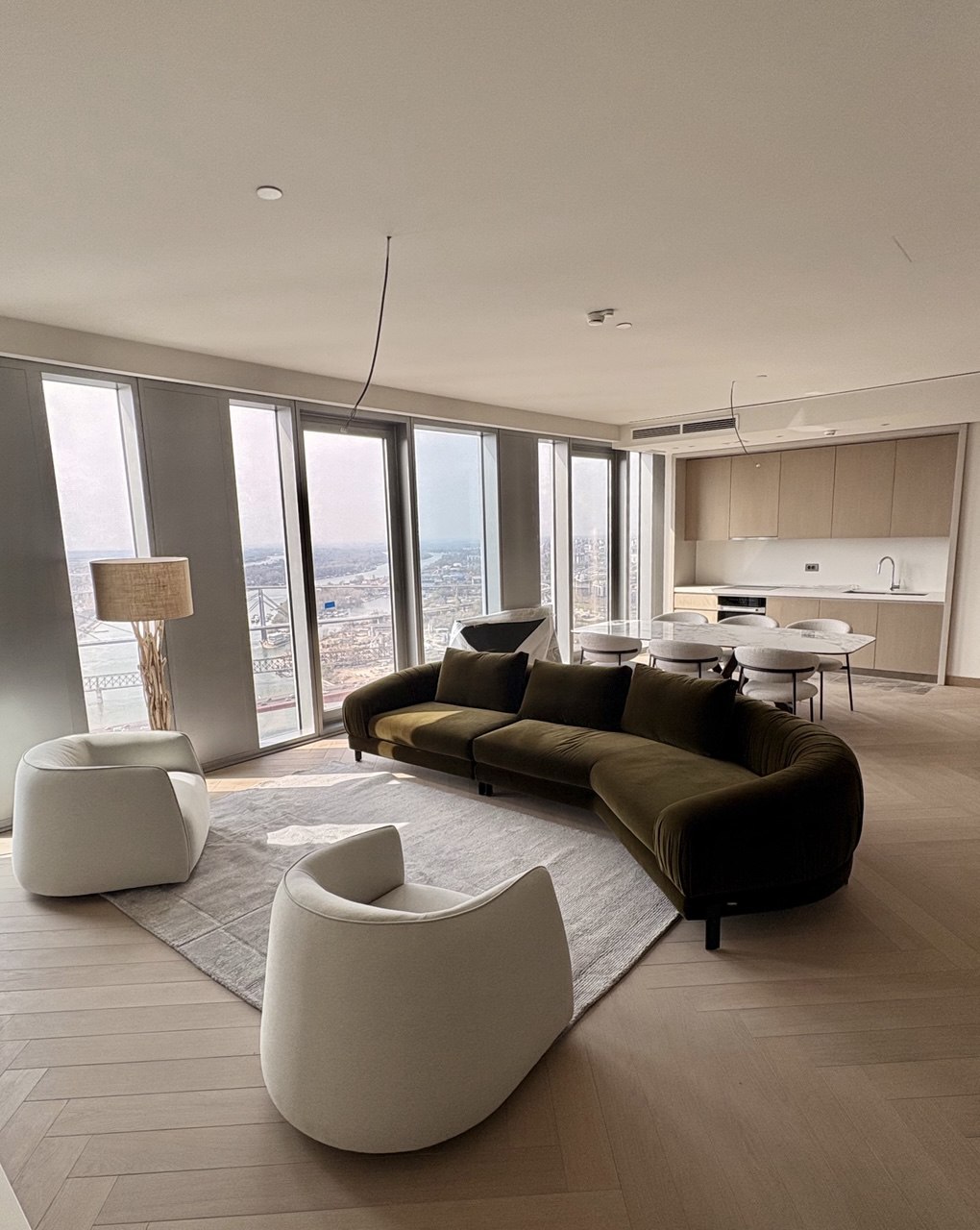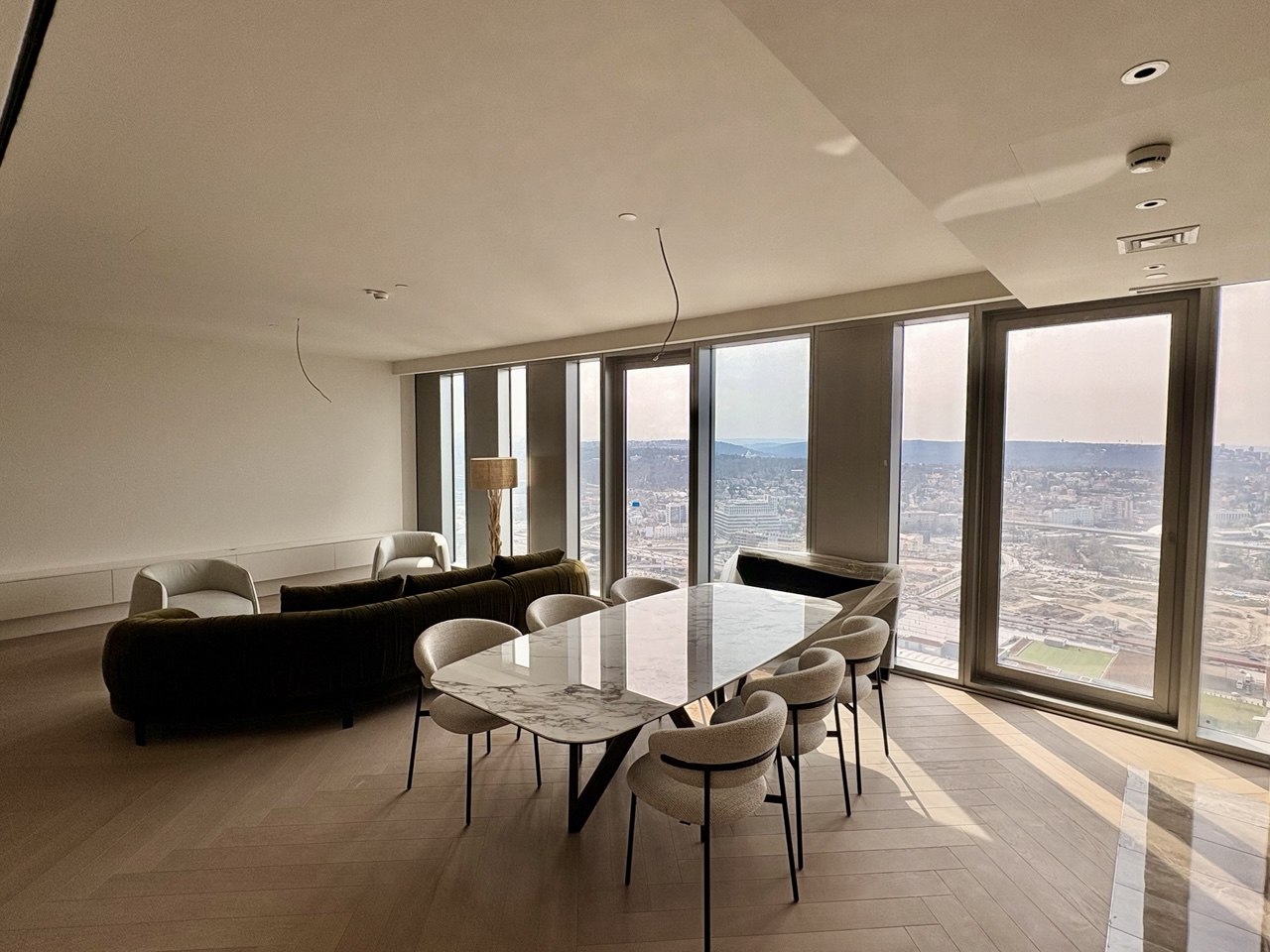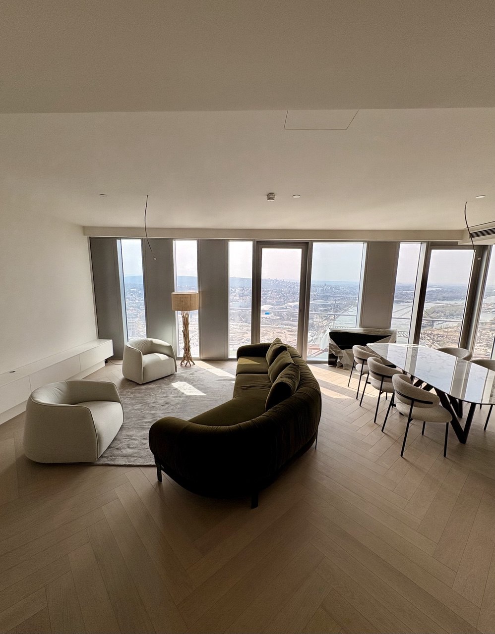 Stan ukupne površine 163,50 m² odlikuje se pažljivo osmišljenim rasporedom i vrhunskom opremom. Sastoji se od prostranog dnevnog boravka, trpezarije, tri komforne spavaće sobe, četiri moderno opremljena kupatila i hodnika. Velike staklene površine omogućavaju obilje prirodne svetlosti i pružaju impresivan panoramski pogled na grad i reku.